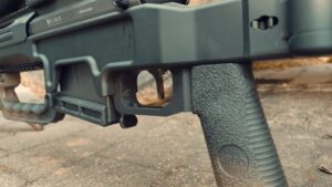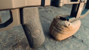 Chwyt to typowy chwyt znany z platformy AR. Łatwo go zamienić na inny w zależności od potrzeb i budowy anatomicznej strzelca. W PRS może pojawić się problem u niektórych strzelców z kciukiem. NIektórzy w przypadku postawy leżąc nie obejmują kciukiem kolby. Może to przynosić dobre efekty w dziurawieniu papieru ale w PRS trzeba zapewnić odpowiednią kontrolę nad bronią.